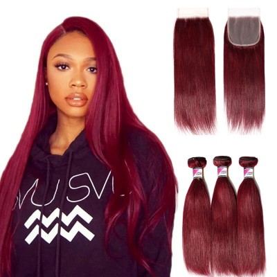 #99j Red Virgin Hair Straight Bundles With 4x4 Transparent Lace Closure